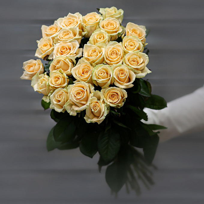 Букет из 25 кремовых роз (Россия) с лентой 60 см