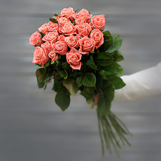 Букет из 21 коралловой розы (Россия) с лентой 60 см