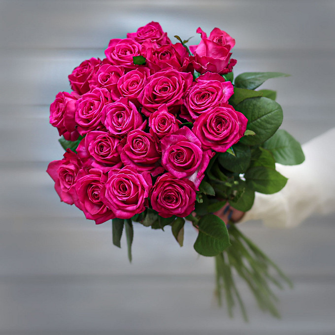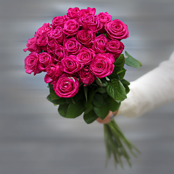 Букет из 21 малиновой розы (Россия) с лентой 60 см