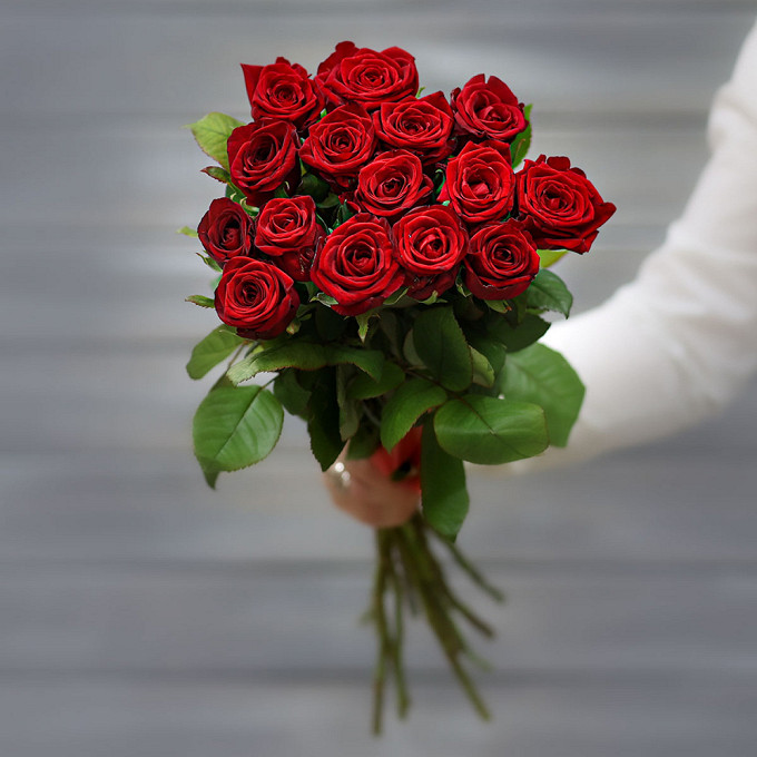 Букет из 17 красных роз (Россия) с лентой 60 см