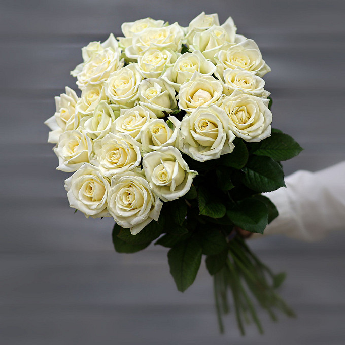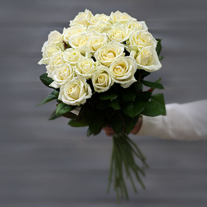 Букет из 21 белой розы (Россия) с лентой 60 см