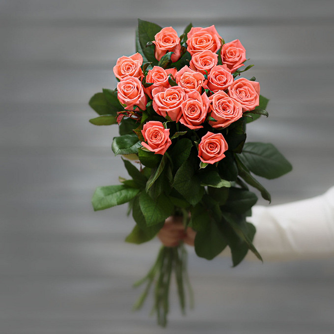 Букет из 17 коралловых роз (Россия) с лентой 60 см