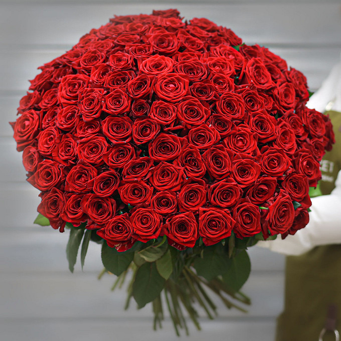 Букет из 101 красной розы (Россия) с лентой 60 см