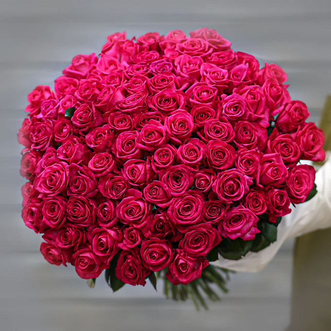 Букет из 101 малиновой розы (Россия) с лентой 60 см