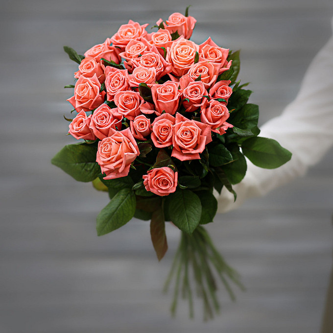 Букет из 29 коралловых роз (Россия) с лентой 60 см
