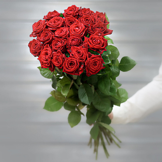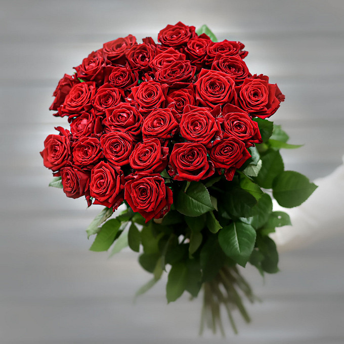 Букет из 29 красных роз (Россия) с лентой 60 см