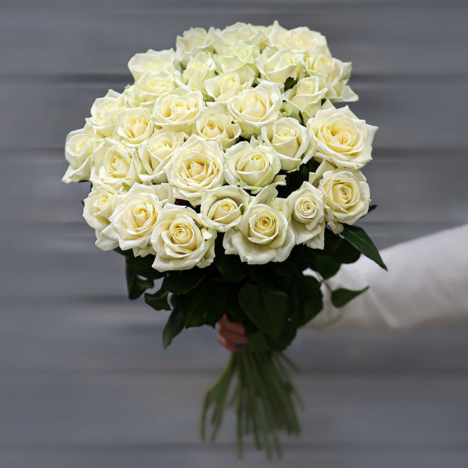 Букет из 29 белых роз (Россия) с лентой 60 см