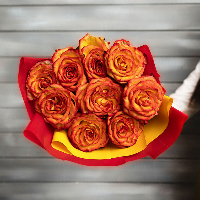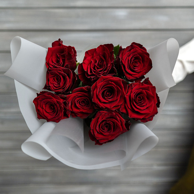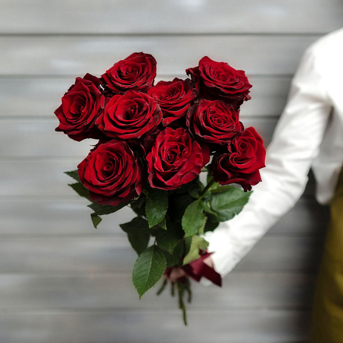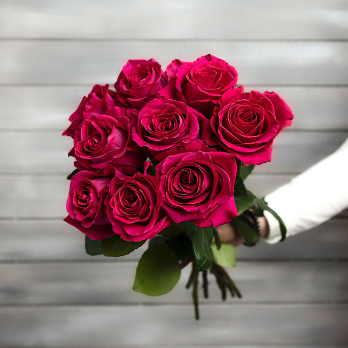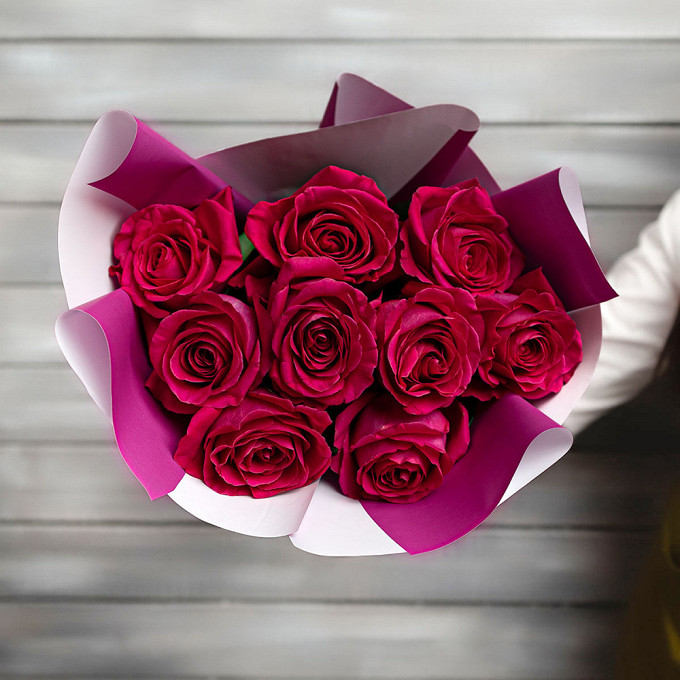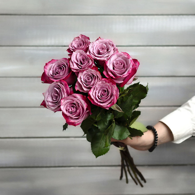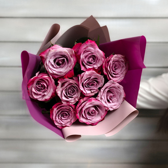 9 фиолетовых роз Эквадор 50 см в упаковке