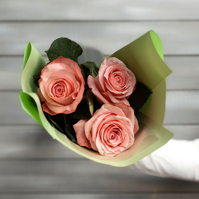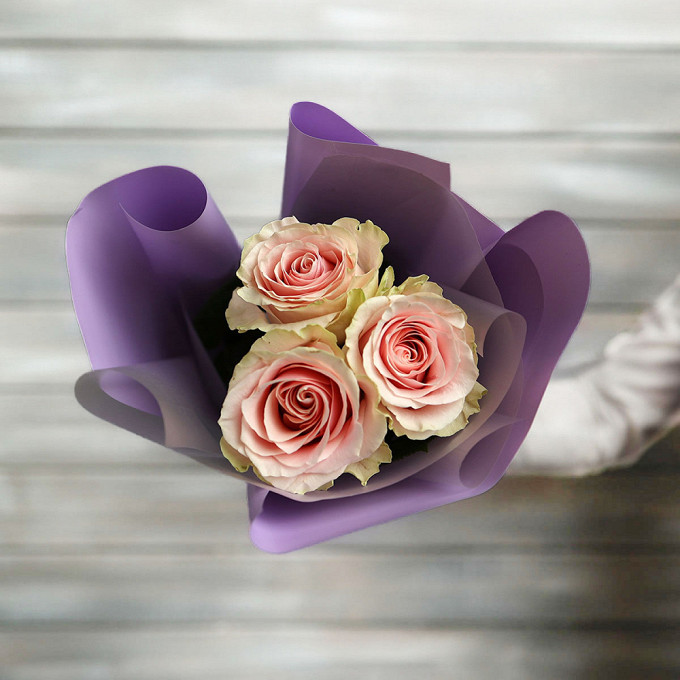 3 нежно-розовые розы Эквадор 50 см в упаковке