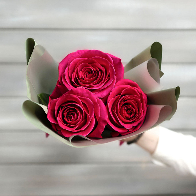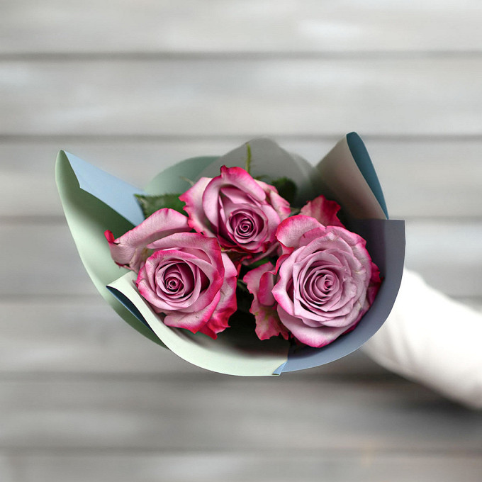 3 фиолетовые розы Эквадор 50 см в упаковке