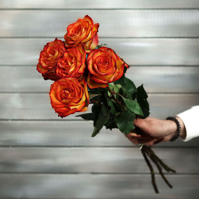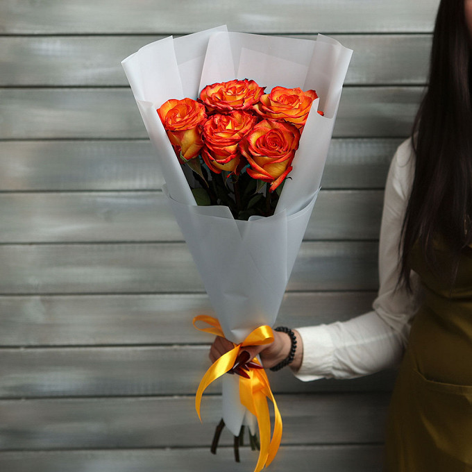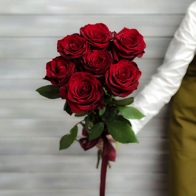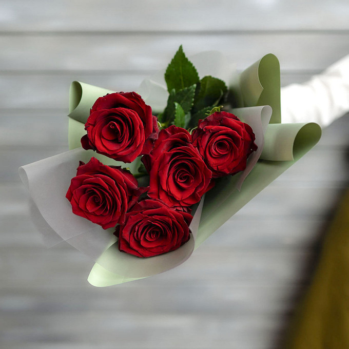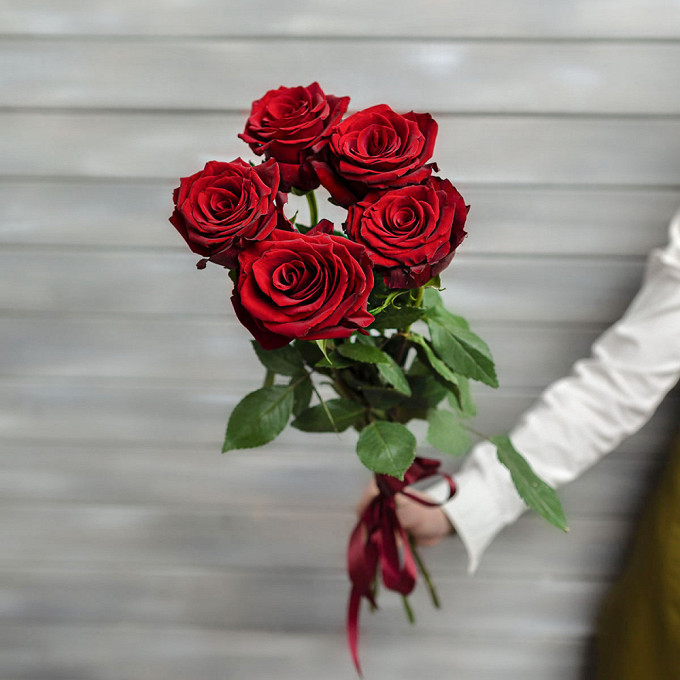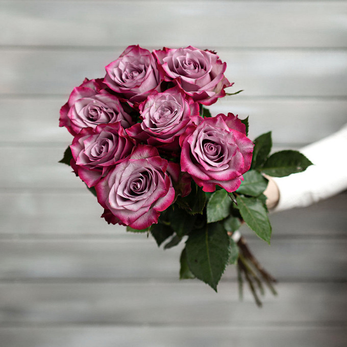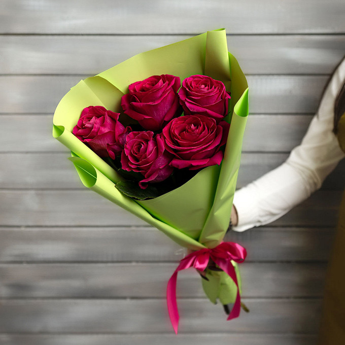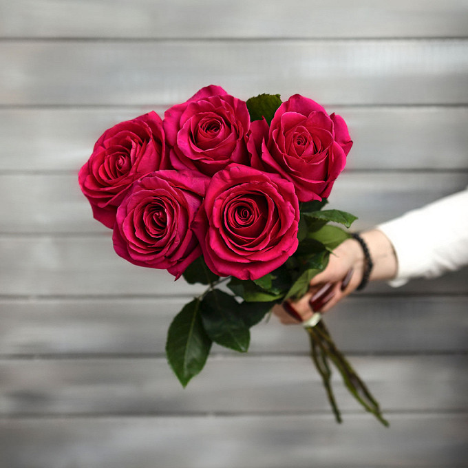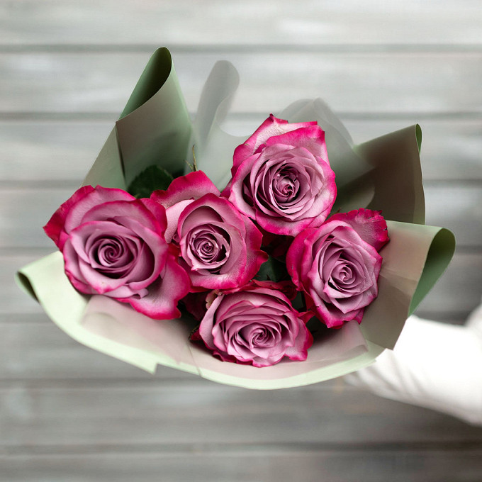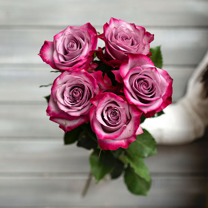 5 фиолетовых роз Эквадор 50 см в упаковке